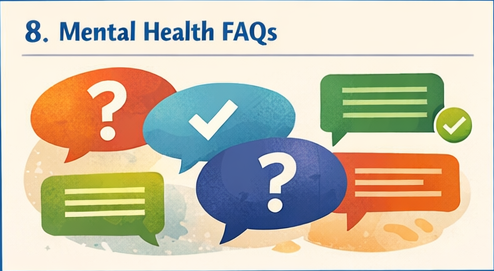 Q: What is the difference between mental health and mental illness? Mental health refers to everyone’s overall psychological well-being — it is universal. Mental illness refers to specific diagnosable conditions that significantly impair functioning. You can have poor mental health without a diagnosis, and someone with a mental illness can maintain strong overall well-being through treatment and support.